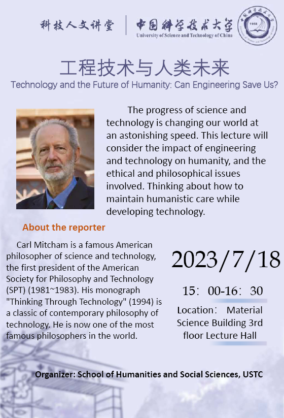 作為“科技人文講堂”系列報告會之一,世界著名科技哲學家Carl Mitcham教授將來我校做學術報告。歡迎全校感興趣的師生參加。