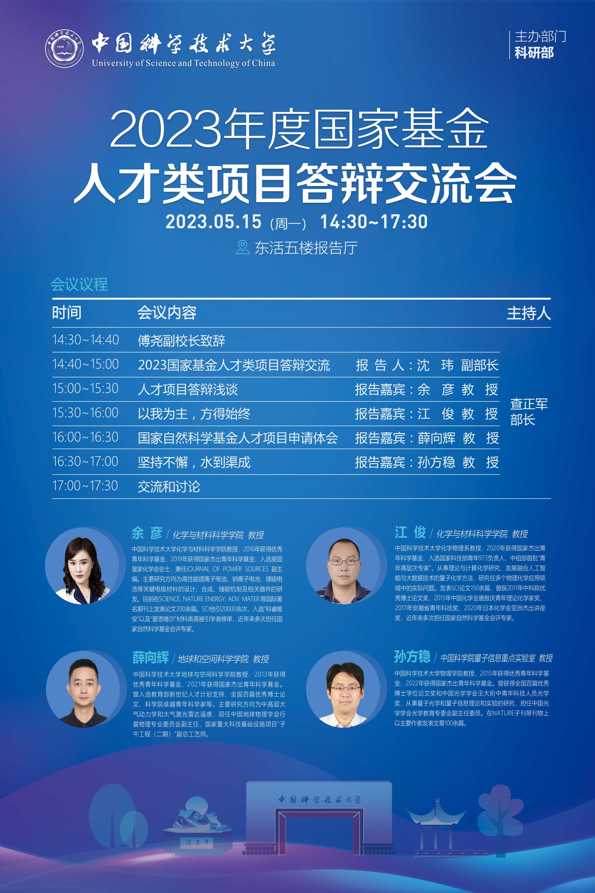 為做好我校2023年度國家自然科學基金杰青、優青等人才類項目答辯工作,提升答辯質量,學校將于5月15日組織召開“中國科學技術大學2023年度國家基金人才類項目答辯交流會”。本次會議科研部特邀多領域專家解讀人才類項目答辯要點及分享相關經驗等。