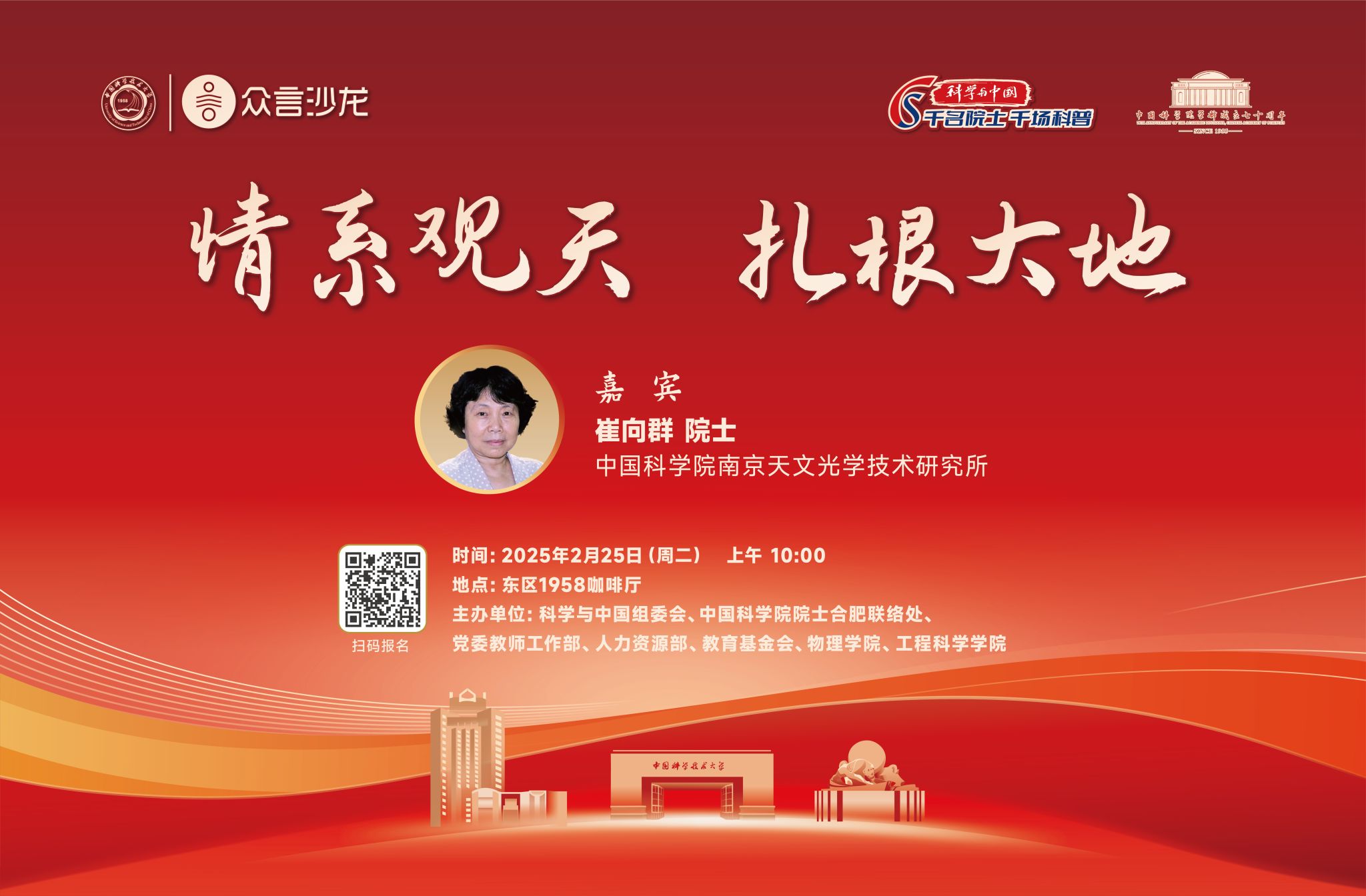 2025年是中國科學(xué)院學(xué)部成立70周年,為弘揚(yáng)科學(xué)精神,講述院士故事,營造熱愛科學(xué)、崇尚創(chuàng)新的濃厚氛圍,“科學(xué)與中國”——第26期“眾言沙龍”活動將以“情系觀天 扎根大地”為主題,邀請?zhí)煳膶W(xué)家、中國科學(xué)院南京天文光學(xué)技術(shù)研究所崔向群院士作為嘉賓,與校內(nèi)師生面對面交流。