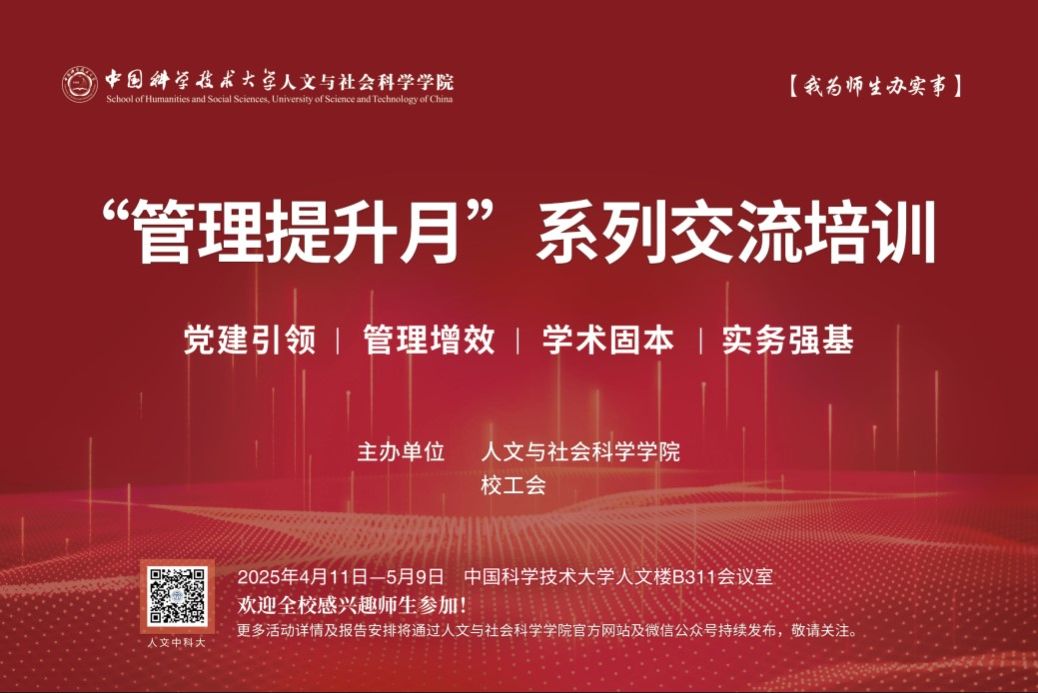 為進一步提升管理效能、強化服務意識,人文與社會科學學院聯合校工會共同舉辦“管理提升月”系列交流培訓活動。本次活動將邀請全校相關機關部門負責同志開展專題報告,共16場。旨在通過黨建引領、管理增效、學術固本、實務強基等方面的交流培訓促進跨單位協作、提升管理能力。現將有關事項通知如下: