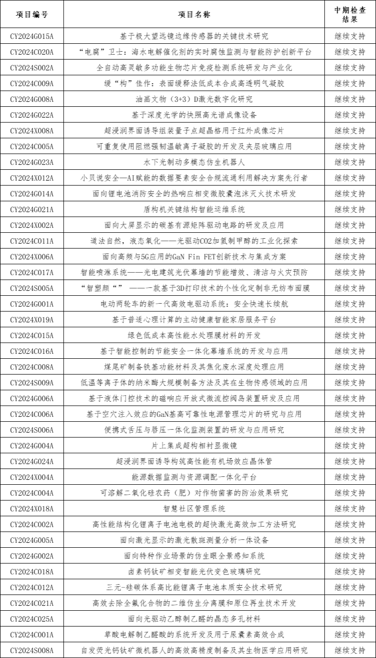 按照工作安排,根據《關于開展2024學年“雛鷹基金”、“雄鷹基金”中期檢查的通知》要求,經材料提交、走訪核實、二次復核及專家評審,確定“基于極大望遠鏡邊緣傳感器的關鍵技術研究”等136個“雛鷹基金”項目作為繼續支持項目;確定“基于WGM微腔的窄線寬激光器研發與產業化”等37個“雄鷹基金”項目作為繼續支持項目。現將中期檢查結果公布如下: