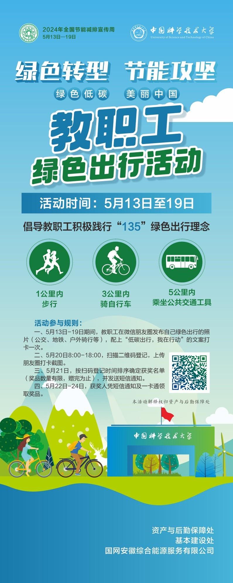活動內容:倡導教職工積極踐行“135”綠色出行理念(即1公里內步行,3公里內騎自行車,5公里內乘坐公共交通工具)。活動期間,教職工在微信朋友圈發布自己綠色出行的照片(公交、地鐵、戶外騎行等),配上“低碳出行,我在行動”的文案打卡一次,即可有機會獲得獎品一份(參與方式見附圖)。